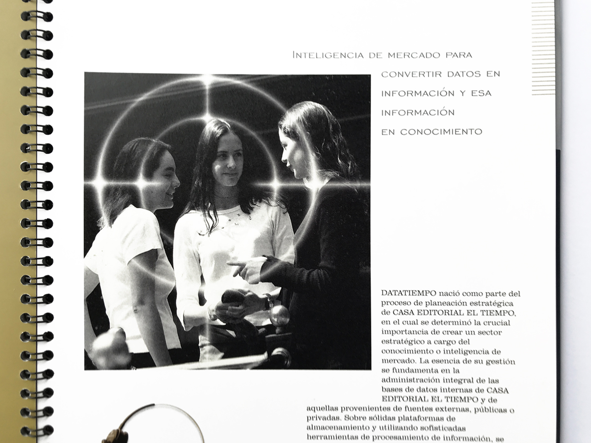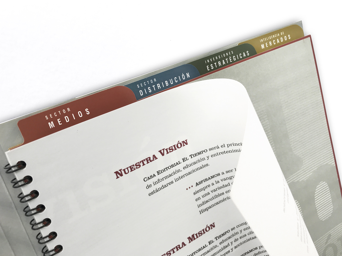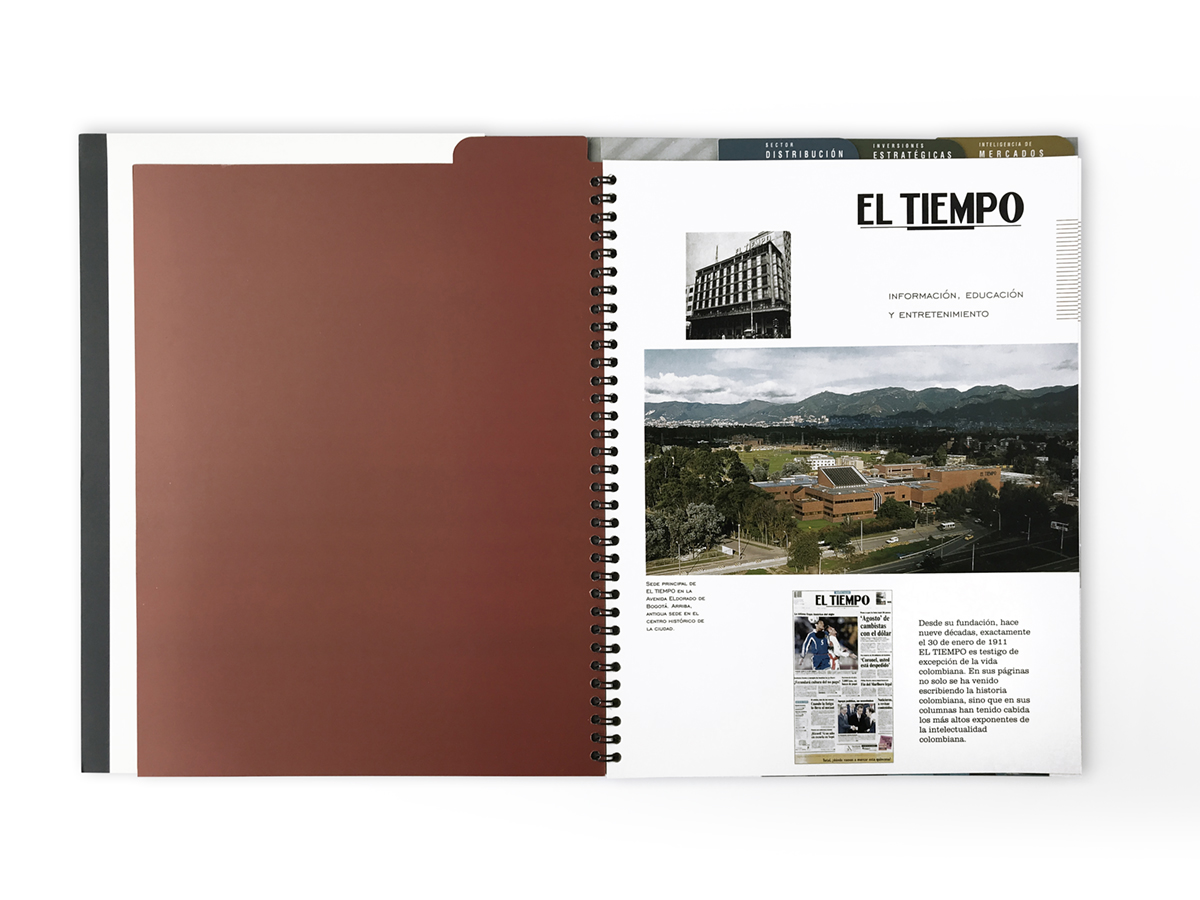 When we asked the general manger of Casa Editorial El Tiempo (the first conglomerate of news and entertainment in Colombia), why did he wanted our studio to do the concept and production of a brochure that presents all the companies that belong to this holding (having so many recognized and excellent journalists) he simply replied: “because they are so focused on their activities, that they aren’t going to have the capacity of synthesis and panoramic view that this case requires”. The instruction was simple: 2 pages per company, nothing more. Therefore, we managed to interview the CEOs, research data and photos, and so, write the content and design the brochure while also coordinating the printing production.